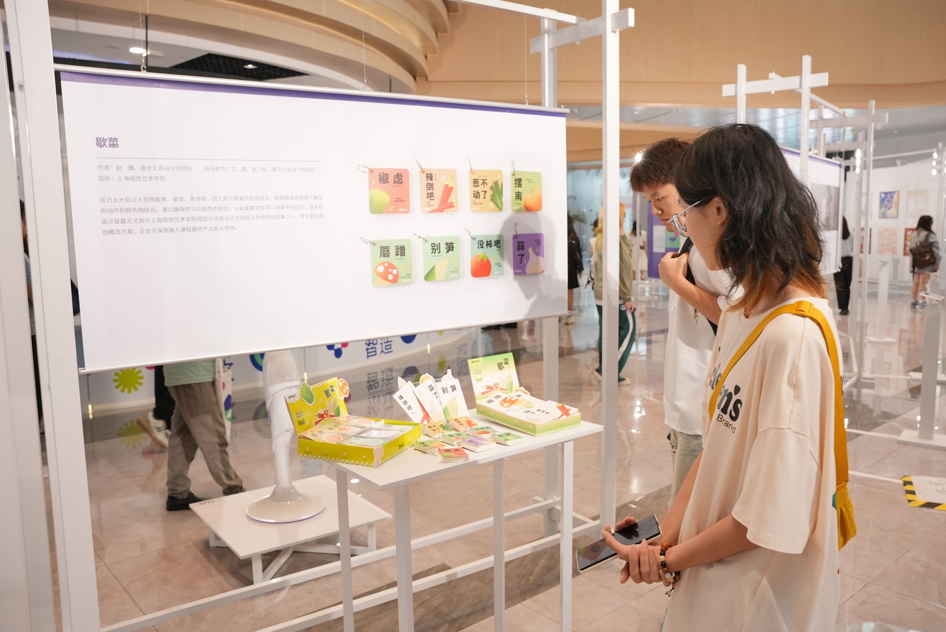在本次大會現場,晨光就帶來了與上海視覺藝術學院共創的“無所不卷”、“歇菜”等系列的創新產品成果,受到現場眾多關注。