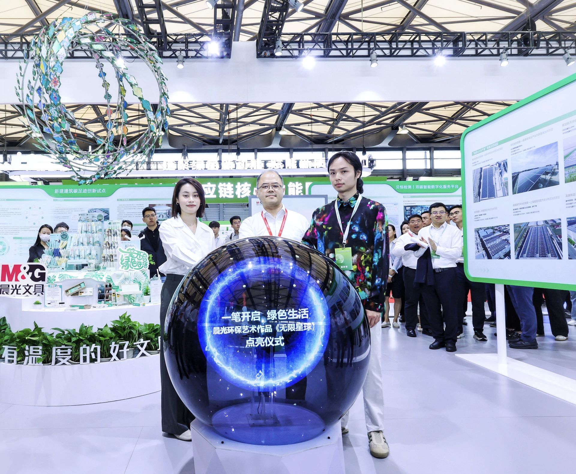 作為臨港集團(tuán)開(kāi)館啟動(dòng)儀式亮點(diǎn)裝置之一,6月5日上午,臨港集團(tuán)總裁翁愷寧、晨光首席可持續(xù)發(fā)展官陳姿丹攜手藝術(shù)家袁隆共同點(diǎn)亮《無(wú)限星球》環(huán)保藝術(shù)裝置,其背后的可持續(xù)共創(chuàng)理念引發(fā)熱議,成為上海國(guó)際碳中和博覽會(huì)一大關(guān)注焦點(diǎn)。