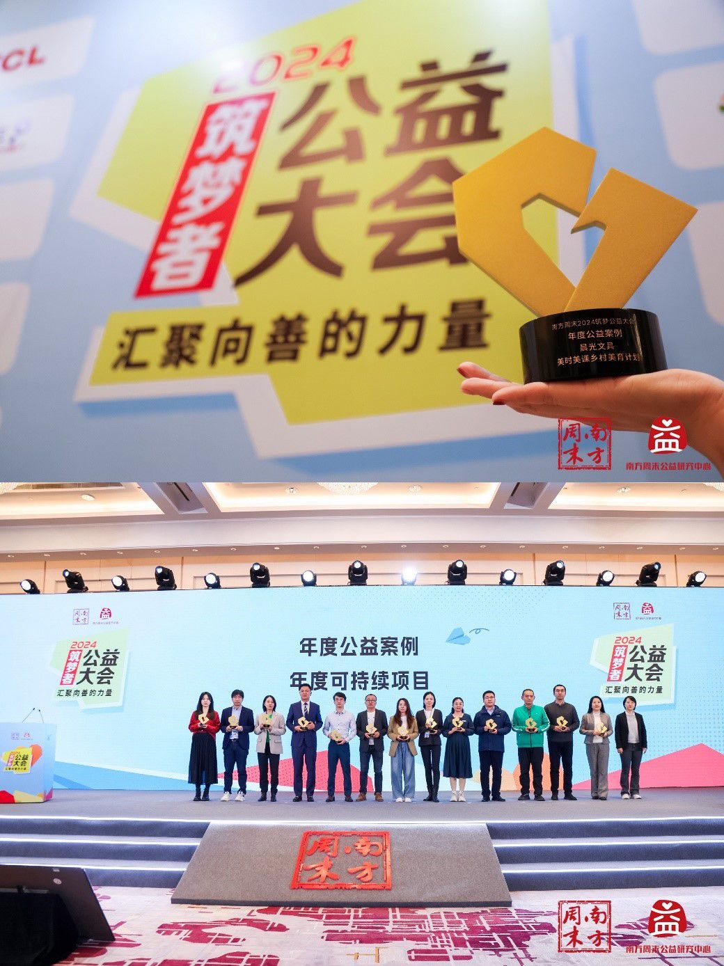 發布日期:2024-11-272024年11月25日,由南方周末主辦的第五屆筑夢者公益大會在北京隆重舉行。作為業內具有廣泛影響力的公益盛會,大會旨在為支持公益事業的企業和機構提供展示成果、交流經驗的平臺,為推動中國公益事業的可持續發展注入新的活力和動力。本屆大會匯聚眾多公益領域的知名機構和社會團體,嘉賓們齊聚一堂,共同分享知識成果,探討公益業態,賦能行業發展。會上,晨光憑借“美時美課”鄉村美育計劃榮獲2024“年度公益案例”獎項。