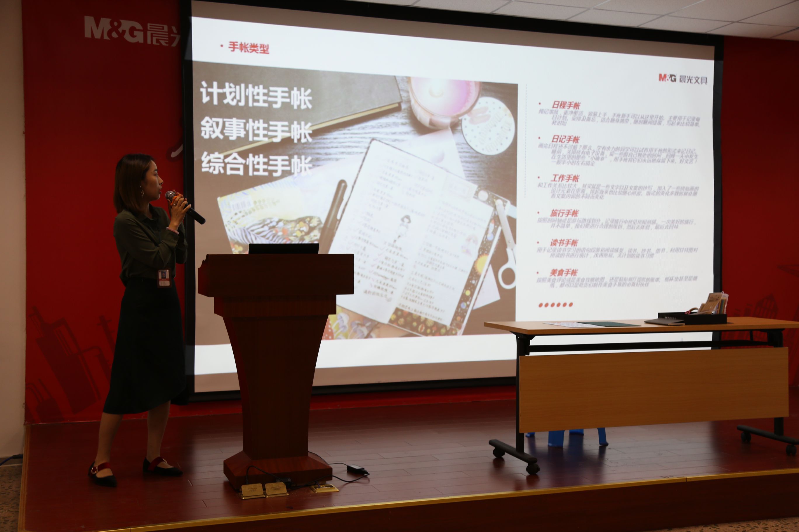 阿怪老師通過現場教學結合視頻演示,言傳身教,教大家使用簡單的A4卡紙和便簽紙,利用刀片、直尺等工具,制作項目管理手帳,并在現場與同學們實時互動,答疑解惑。同學們在發揮創造力動手實踐的同時,對手帳制作和周邊產品都產生了濃厚的興趣。不少同學紛紛表示,入門進坑太容易,看到阿怪老師的制作精良的手帳作品,也希望自己能夠制作出精美的手帳,豐富業余生活。晨光文具產品中心的手帳達人還給同學們介紹了如何挑選并使用功能適合的手帳本、各類書寫工具、貼紙、書簽、和紙膠帶等手帳周邊產品。
