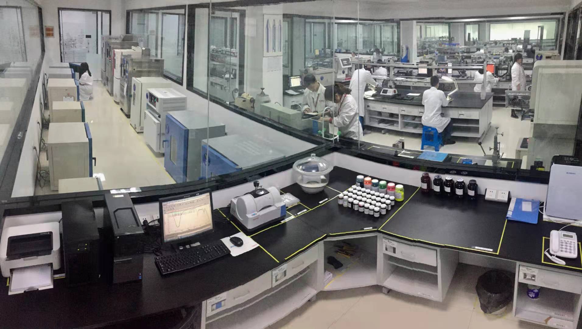 晨光文具檢測實驗室占地1200m2,布局了理化實驗室、光學與力學實驗室、新材料實驗室、環境模擬實驗室、電子實驗室等14間主要功能實驗室,擁有專業的技術人員30名,各類專業的檢測儀器設備138臺。