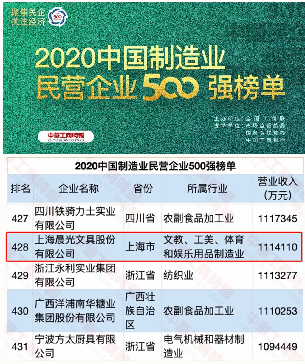 9月10日,由全國工商聯主辦的2020中國民營企業500強峰會在北京召開,會上發布2020中國制造業民營企業500強榜單,晨光文具以111.41億元營收榮膺第428位,這也是晨光文具首次入圍此榜單。